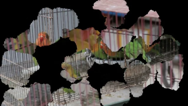 I filmed two Shanghai artists, Zhuang Yin and Zhao Bo, who took me to their favorite places. Yin chose a small grove of trees – an urban oasis surrounded by building construction. Bo chose a busy street market for plants and pets. With ink on xuan paper I made abstract shapes that I animated and composited into videos from the orchard and market.